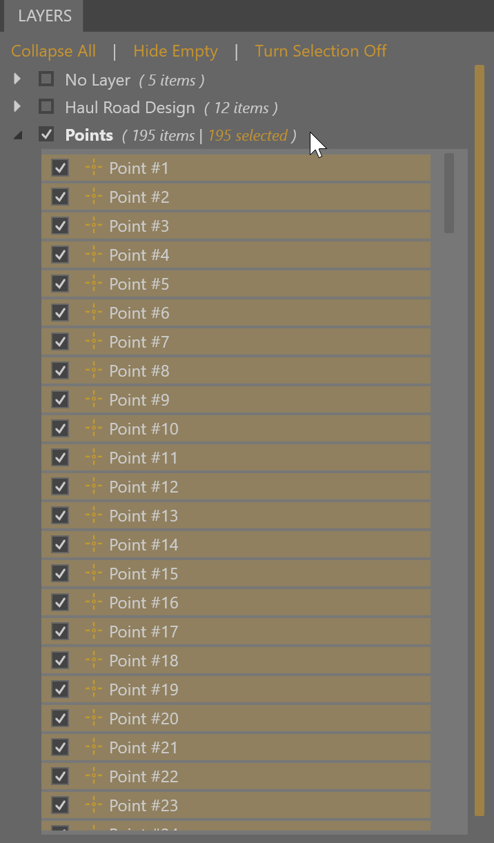 You can select project content directly from the Viewport, or use the Layers panel to select geometries and features that you want to edit, move, copy, rotate, or remove within your project. When selected, the content is highlighted in both the Viewport and the Layers panel.