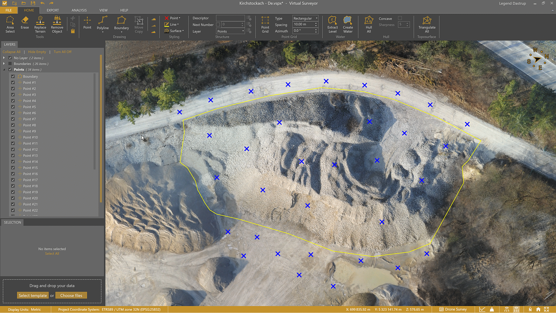 Select project content directly from the Viewport, or use the Layers panel to select geometries and features that you want to edit, move, copy, rotate, or remove within your project. When selected, the content appears highlighted in the Layers panel and the Viewport. There are several ways to make a selection in the VirtualSurveyor app, depending on what you're trying to do.