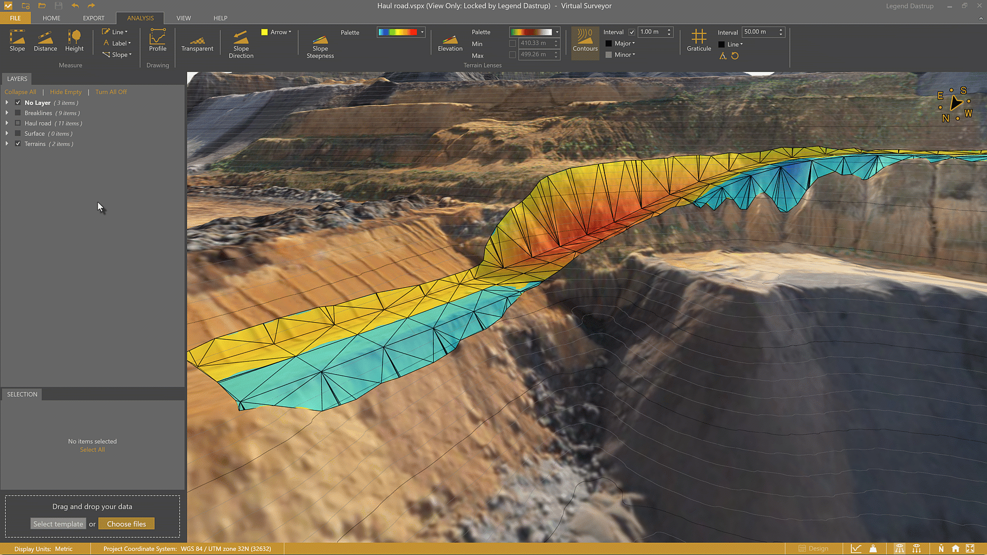 In the View Only mode you can make use of the Analysis Tab which includes access to Measurement Tools and Terrain Lenses. You can also view the Timeline, create and view profile lines, watch flythroughs, enable/disable elements in the Layers panel, and change between 2D and 3D viewing modes (note: any changes you make to the project will not be saved while in View Only mode).