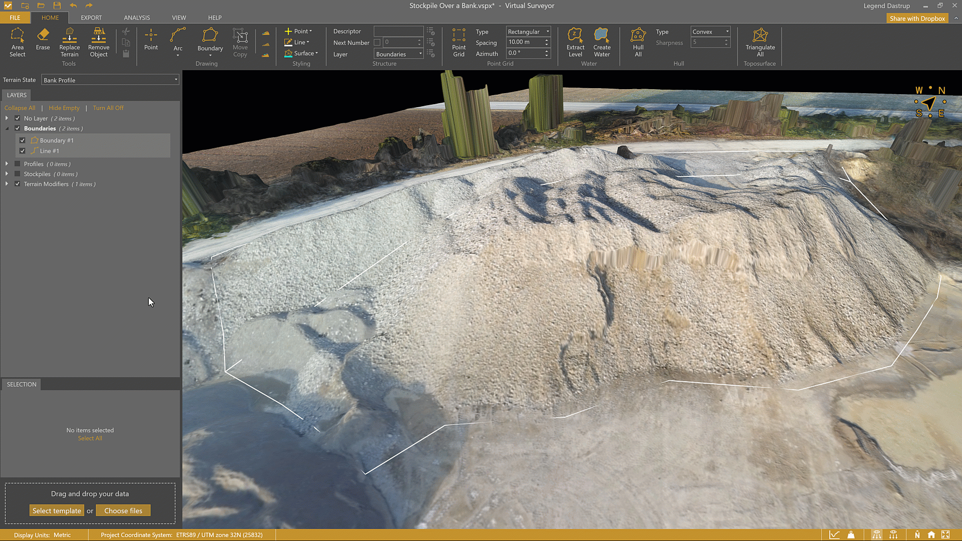 - Draw a Boundary Around the Stockpile: Select the Boundary tool from the HOME tab and start drawing a boundary around the stockpile. Be sure to place vertices on the visible parts of the ground around of the stockpile.