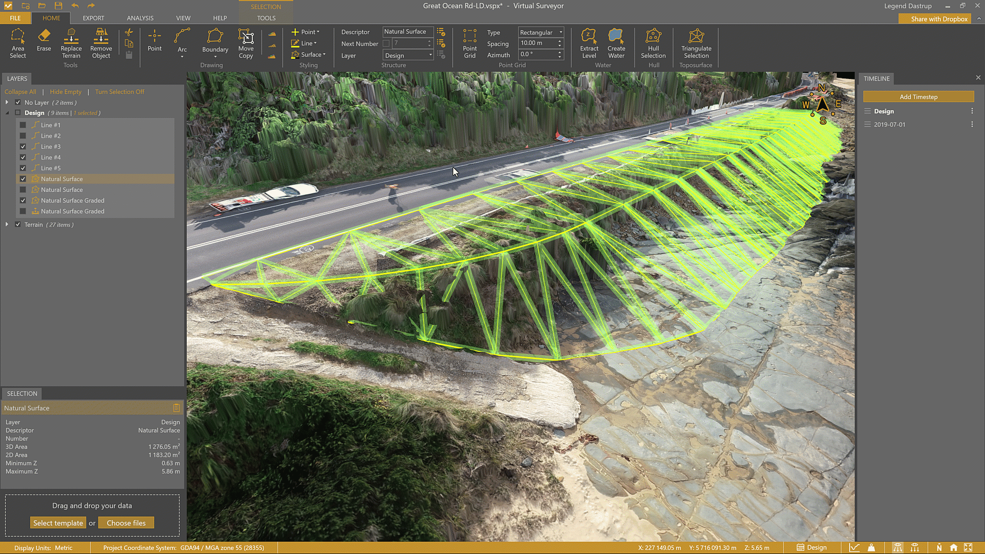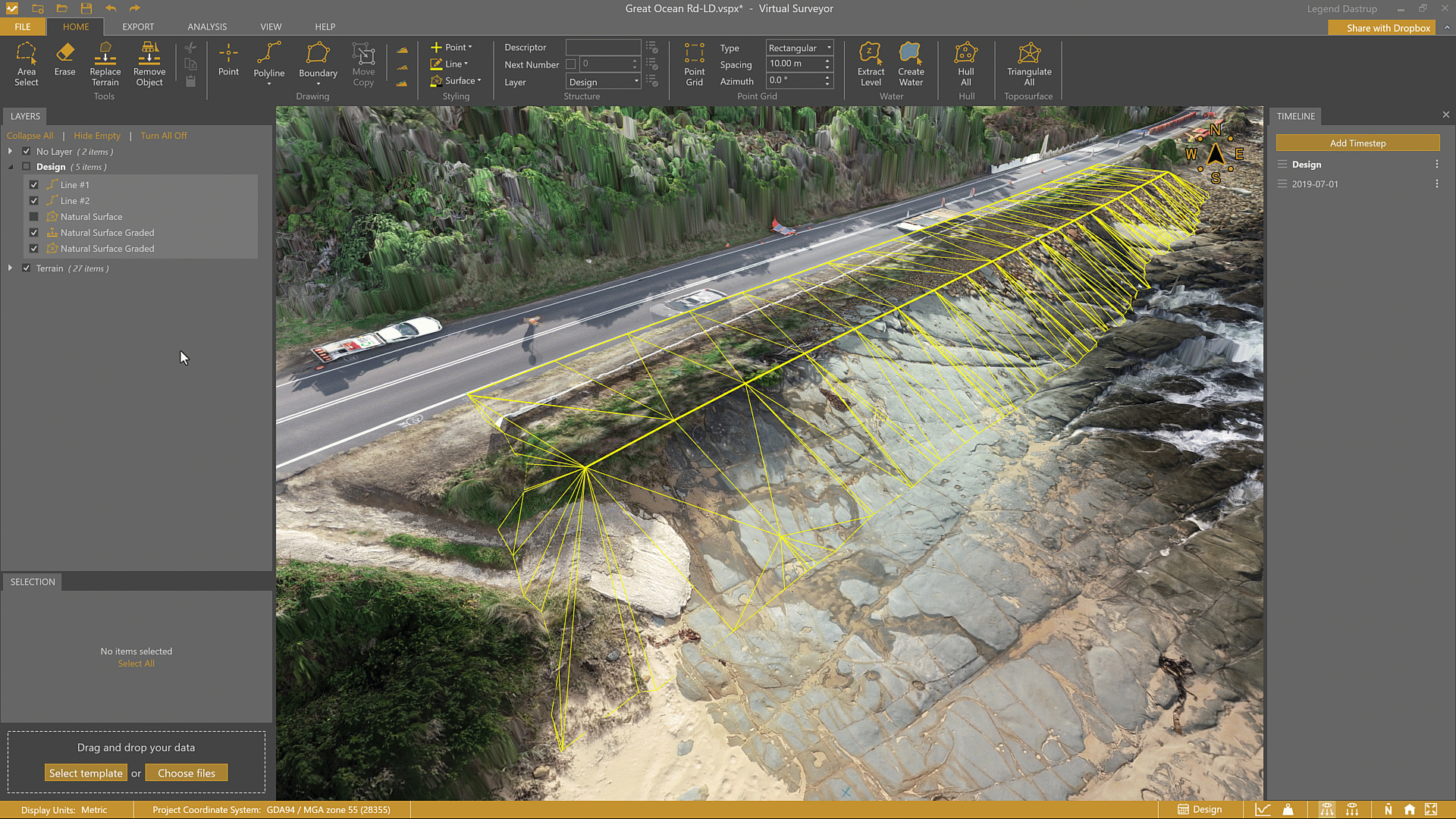 When creating a design in Virtual Surveyor, it is essential to work with two timesteps: one for the baseline survey and one for the design. The baseline timestep contains the elevation model (DSM) and orthophoto from your initial survey, which serves as the foundation for your design.