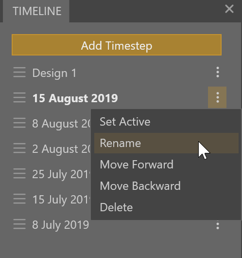 The Timeline should be organized with the most recent Timesteps at the top. Having the proper chronology of Timesteps is essential to ensure that any work done (like cut and fill maps) are presented properly.