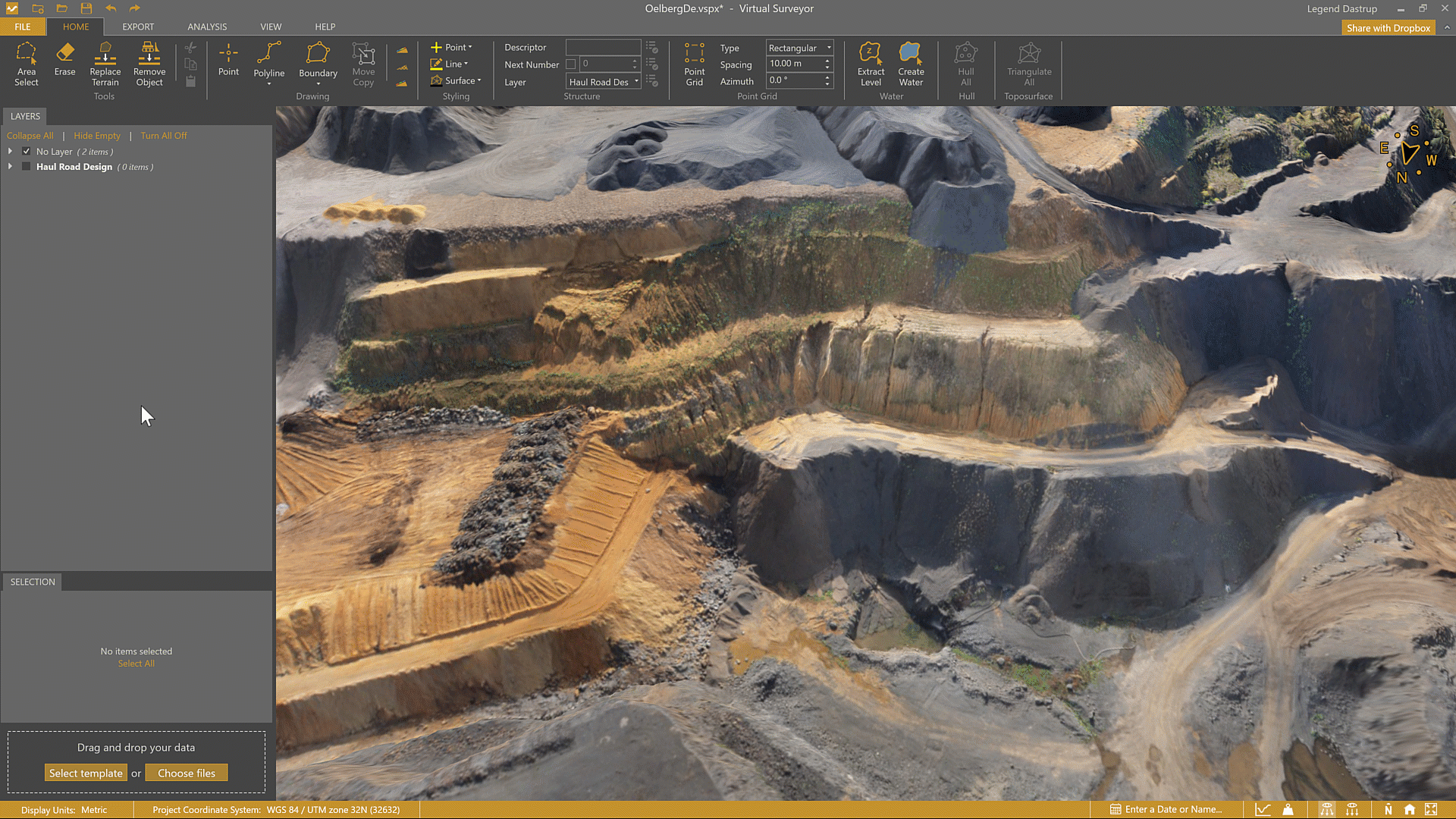 This article is a workflow on how to design a haul road for a mine in the Virtual Surveyor app. We'll create the structure of a haul road with a properly drawn centerline, slope angles, and create the grading for the road, then estimate material volumes, export the surface as a machine control model, and track the build progress over time.