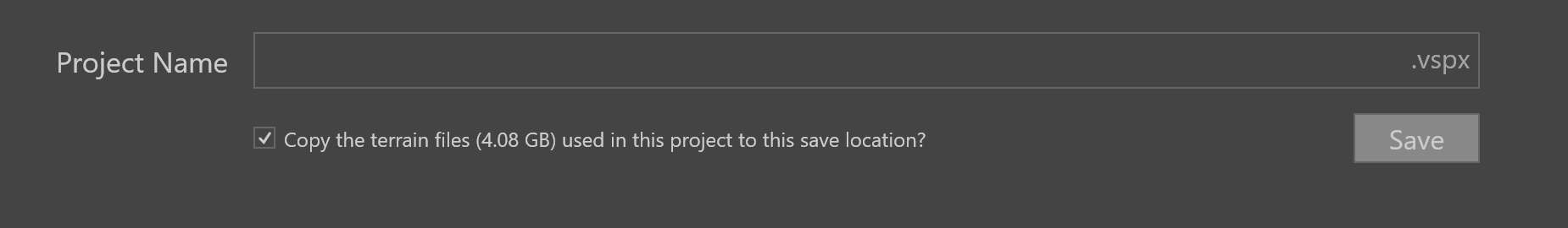 You can use the Copy Terrains or Save a Copy function to include and consolidate your terrain files to a single project folder. I.e., your terrain files may be stored in a separate location from your .vspx project file, so you can use either the Copy Terrains function or Save a Copy to move your terrain data to the same location as your project file.