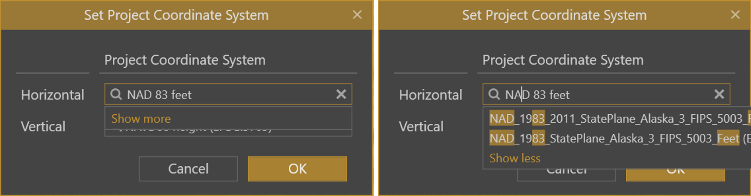 Selecting the right coordinate system is now faster and more intuitive. Instead of scrolling through long lists, Virtual Surveyor remembers your last used system and automatically suggests it when your project falls within its valid region. And if you don’t find a suitable system right away, click Show more to expand the list and view additional options.