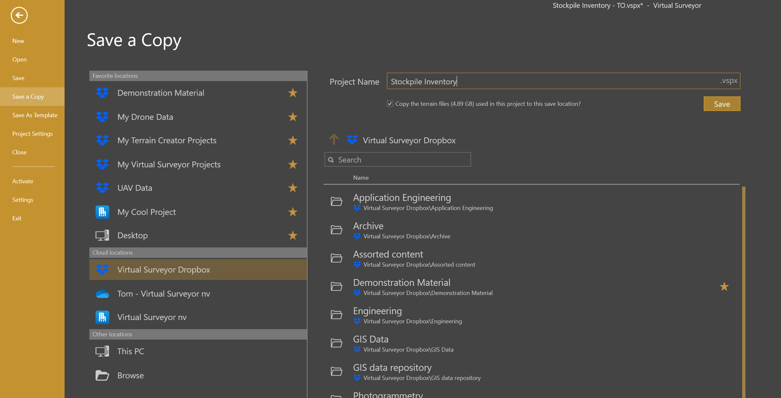 You can now Save a Copy of your Virtual Surveyor or Terrain Creator project and optionally choose to copy all your terrain files along with it. This makes reorganizing or sharing projects within your team much easier.